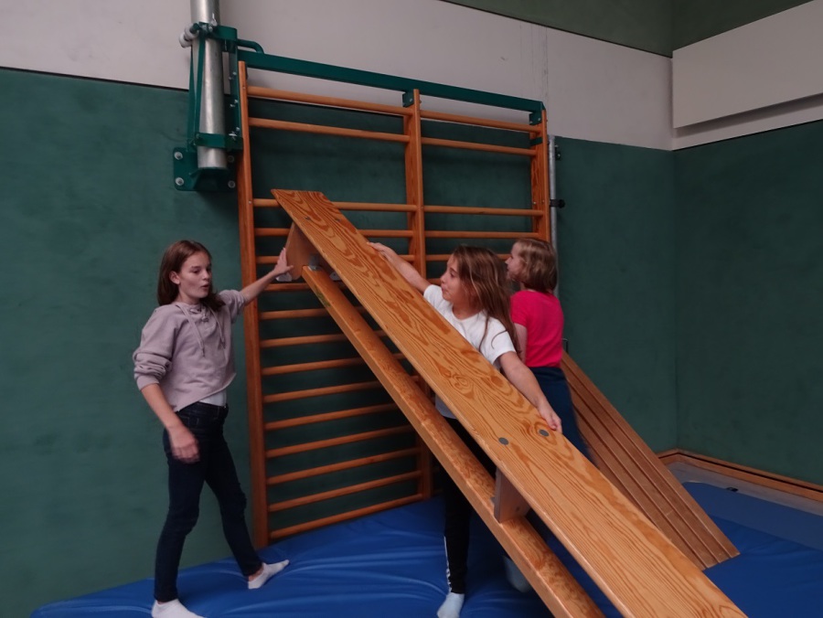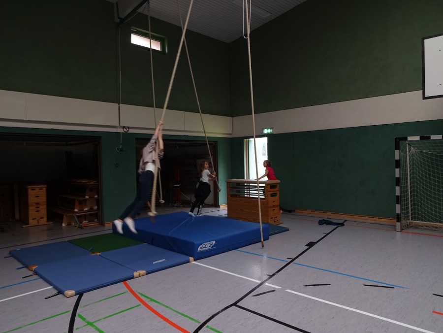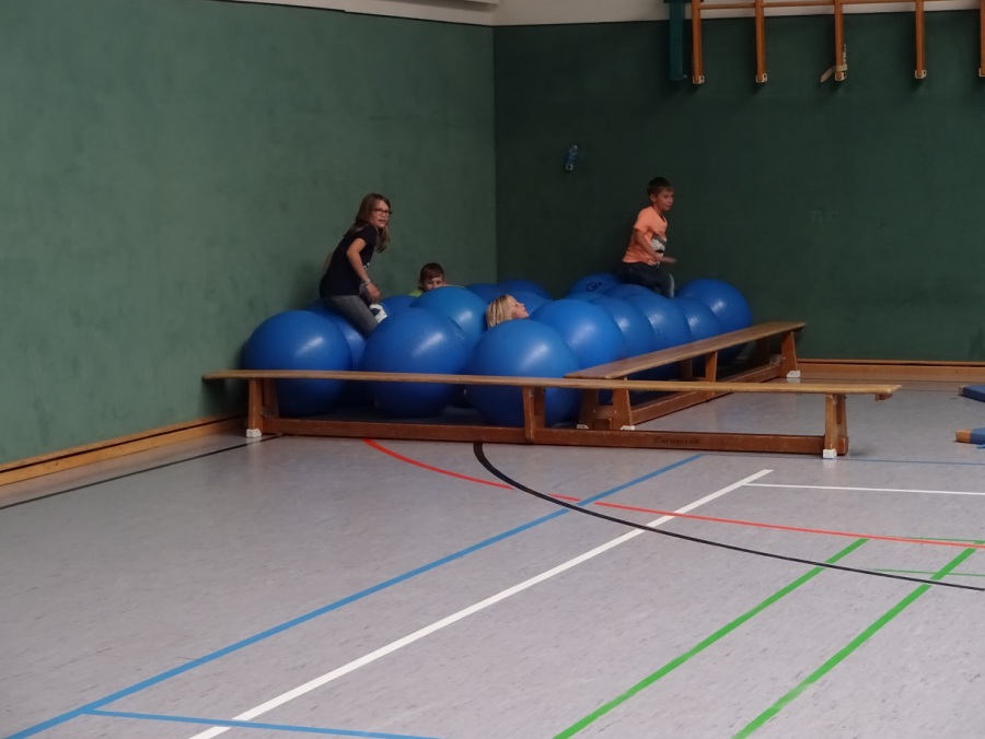 Anschließend durften die Kinder erst einmal toben. Wegen eines Fußballspiels stand der Sportplatz leider zunächst nur zur Hälfte zur Verfügung, aber die Sportanlage bot auch so genügend Platz. Draußen wurde Frisbee gespielt oder mit dem Ball gekickt, in der Halle richteten sich die Kinder aus Bänken und Gymnastikbällen ein Bällebad ein, bauten mit Kästen, Matten und den Seilen eine „Tarzan-Lianen-Anlage“ und die Sprossenwand wurde mit einer eingehängten Bank kurzerhand als Rutsche umfunktioniert.