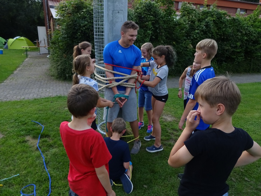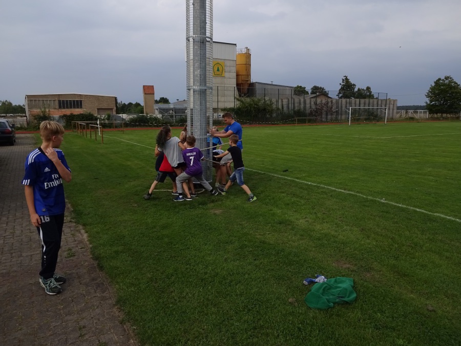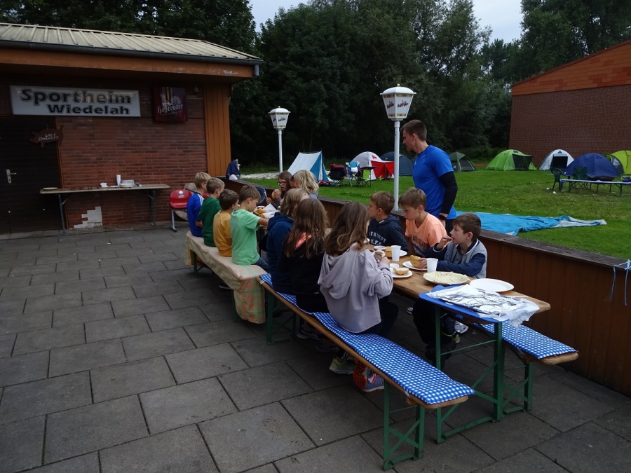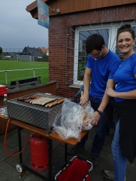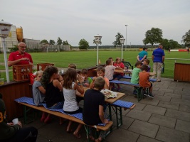 Vor dem Abendbrot wurde es dann noch einmal sportlich. Beim Chaosspiel mussten die Kinder in Mannschaften kleine Zettel mit Nummern suchen, die von den Betreuern auf dem Sportplatzgelände versteckt worden waren. Ob am Mast der Flutlichtanlage, auf der Rückseite der Auswechselbänke, bei der Fahrradabstellanlage oder dem Kassenhäuschen – es gab kaum einen Zettel, der nicht ruck-zuck gefunden war. Während die letzten Zahlen noch gesucht und die verteilten Zettel eingesammelt wurden, wurde auf der Terrasse der Grill angeworfen. Bei Bratwurst und Steak wurde gemütlich der Abend eingeläutet.
