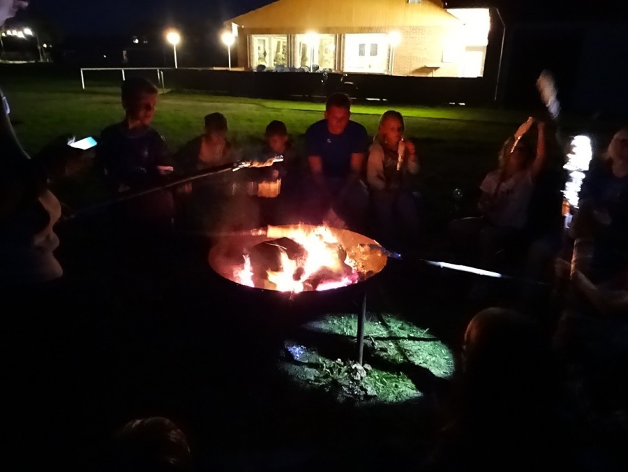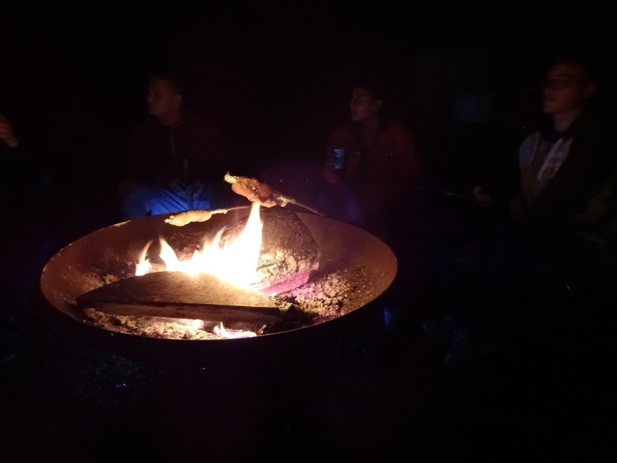 Während auf dem Sportplatz die Bälle hin und her flogen, wurde vor den Zelten ein Feuer angezündet. Als es dunkel wurde, fanden sich schnell alle auf den aufgestellten Bänken rund ums Feuer wieder. Gemeinsam wurde Stockbrot gebacken – eine große Schüssel voll Teig wurde restlos aufgefuttert.