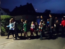 Einen Feldweg entlang ging es zunächst bis zur Kläranlage. Da sich einige Kinder in der Dunkelheit zu sehr fürchteten und sich trotz guten Zuredens nicht trauten, weiter in Richtung Finkenherd zu laufen, wurde die Wanderung dort abgebrochen und es ging durchs Dorf zurück zum Sportplatz, wo wieder ein knisterndes Feuer wartete. Nachdem noch einmal Stockbrot gebacken und ein paar Marshmallows gegrillt worden waren, kehrte langsam Nachtruhe ein.